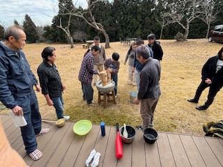 冬の標高400メートルの利他村の新宴会は雪もなく晴天に恵まれ恒例のお餅つきからスタートで今年は毎年参加のベテランが不在で水加減を誤りゆるゆるのお餅になってしまいましたがこれも経験と美味しく頂きました
